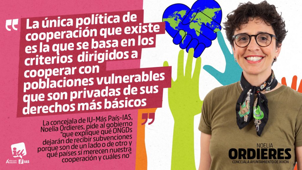 - La concejala de IU-Más País-IAS, Noelia Ordieres, pide al gobierno “que explique qué ONGDs dejarán de recibir subvenciones porque son de un lado o de otro y qué países sí merecen nuestra cooperación y cuáles no”